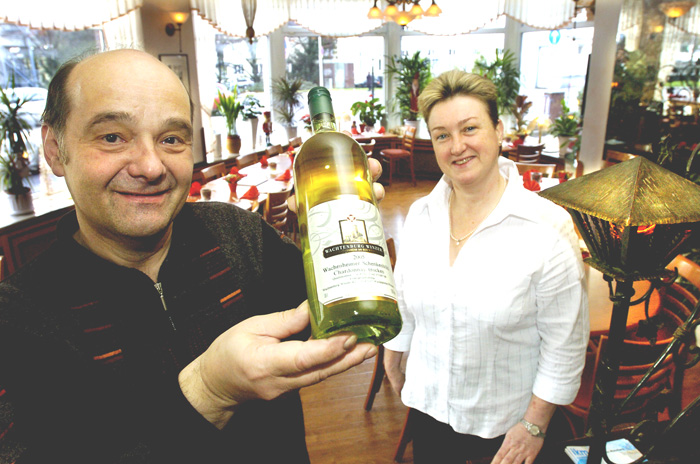 RP-FOTO: KLAUS DIEKER Jürgen Dirksen macht es wie sein Vater Karl. Bei den gleichen Weinkellereien in Rheinland-Pfalz sucht er den Wein selber aus. Für die Küche in der Trotzburg ist Marion Sindelar verantwortlich.